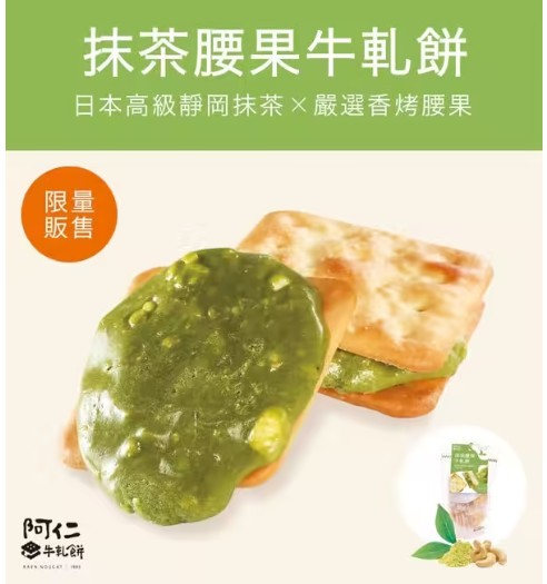 日本進口靜岡抹茶粉(比台製抹茶粉貴5倍)、嚴選頂級越南腰果與鹹甜無蔥牛軋餅的極致搭配,內含高品質安佳奶粉