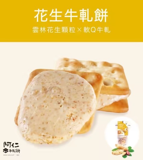 花生來自台灣在地,不惜重本花生顆粒比例超高,阿仁特選濃郁花生飽滿顆粒、鹹香無蔥餅乾與軟Q牛軋的絕頂搭配